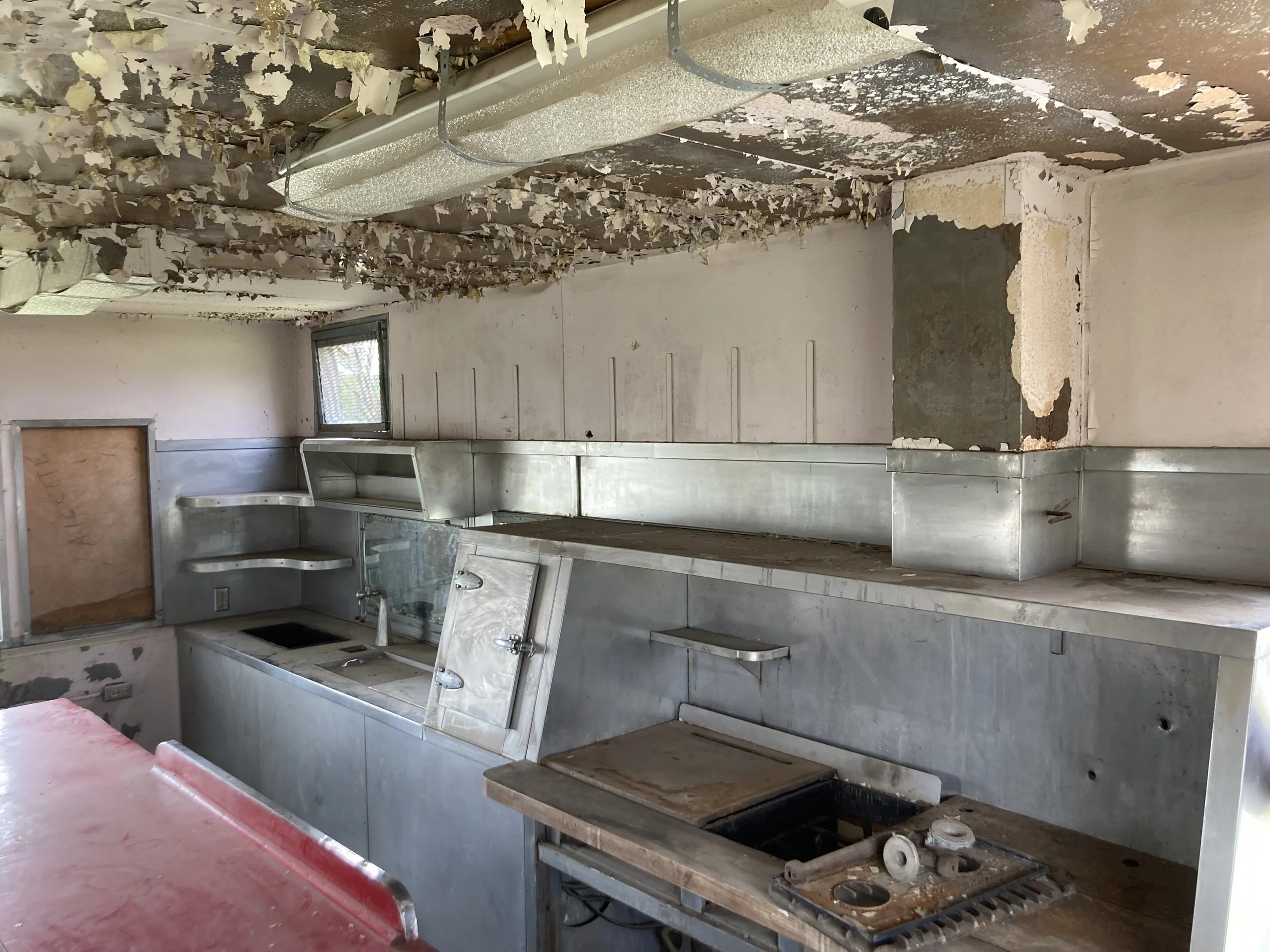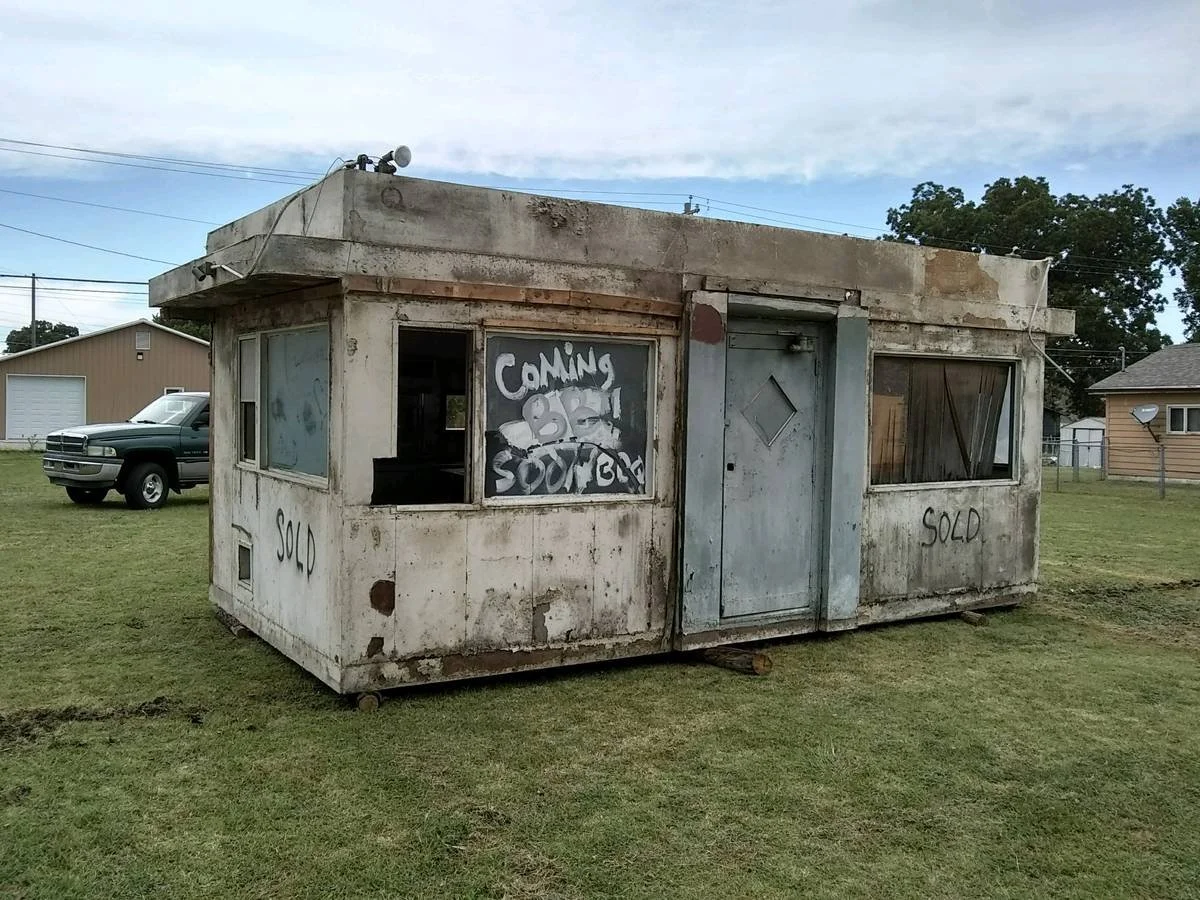 I’ve been fortunate in life, but none of my projects have ever come easy. It’s always been hard work, tight budgets, and a lot of persistence to make things happen. Still, I couldn’t just find a diner and bring it to town — not yet, anyway so the dream is mothballed. Fast-forward to the summer of 2023. Word gets to me about a structure uncovered during a condemned building demolition in Winfield, Kansas — something that had been walled in and hidden for over 50 years. Curiosity got the best of me, sent an text to the guy who tipped me off and by the next morning I was on the road. One of those early designed diners is what they found hidden inside an condemned building in Winfield. Bob had seen it emerge from its hidden time capsule as each board came down and acted quick to save it from the crusher — pulled it aside while the rest of the building came down and spray-painted “SOLD” on the sides just to keep the hovering scrappers away. The exterior looks rough: lots of nail holes from years of cover-ups, a few cuts and hacks here and there — but nothing rusted out, nothing beyond repair.